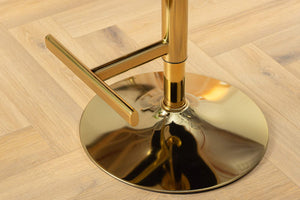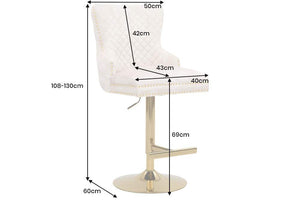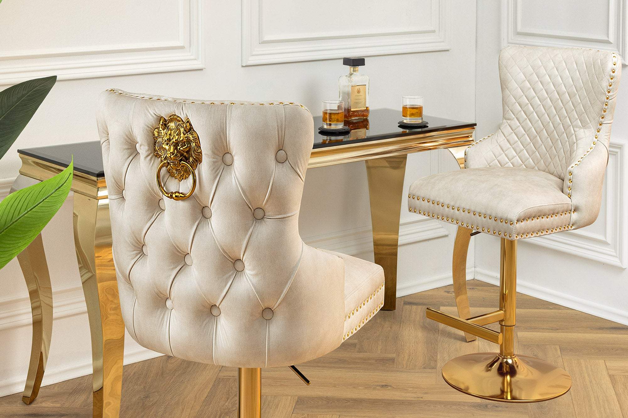 Bemutatjuk a CASTLE állítható magasságú bárszéket, a tökéletes választás mindazok számára, akik egy csipetnyi királyi stílust szeretnének vinni konyhájukba vagy otthoni bárjukba. Puha bézs bársony borítással és feltűnő arany rozsdamentes acél lábakkal ez a barokk stílusú szépség nemcsak jól néz ki – ugyanolyan praktikus, mint amennyire elegáns.