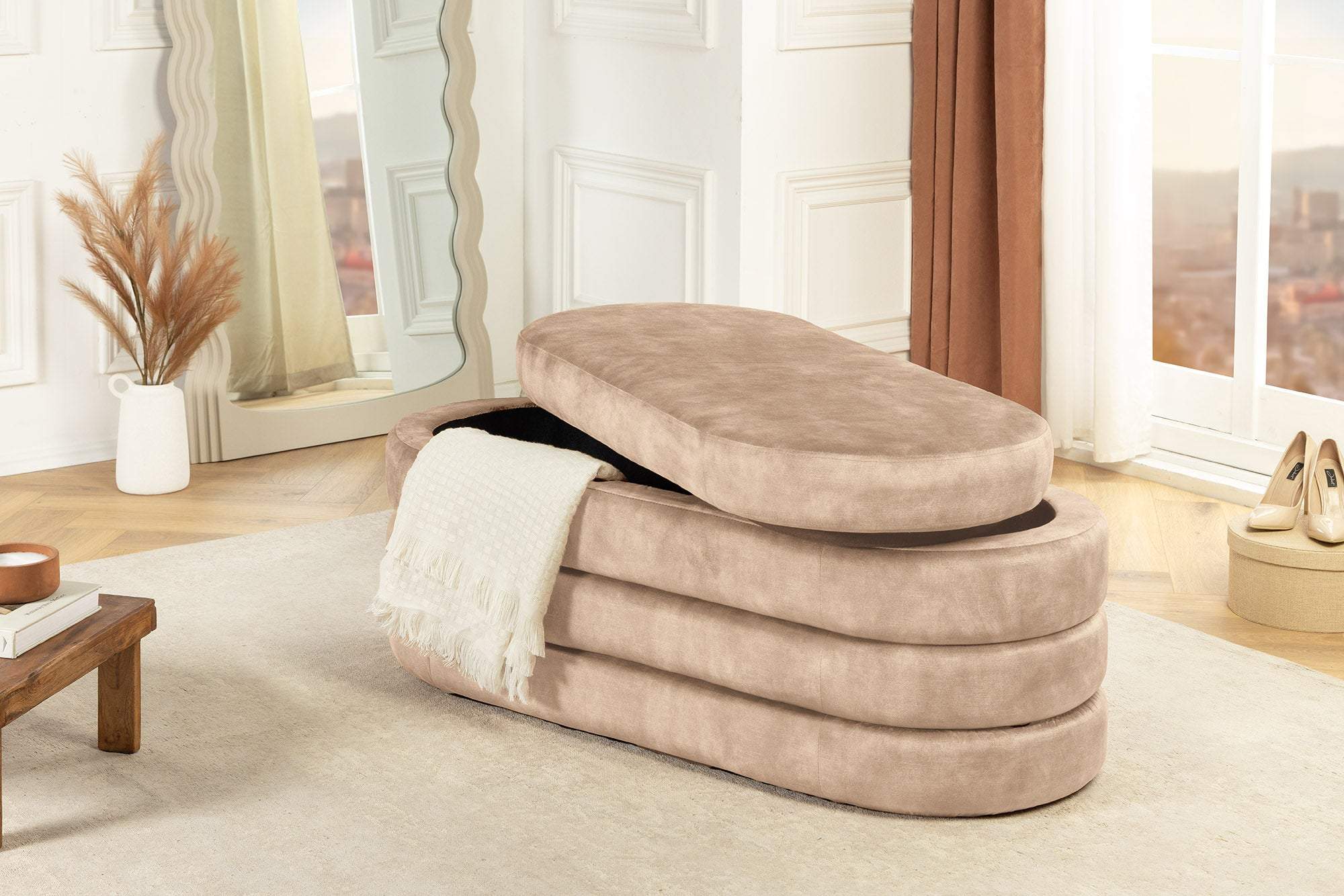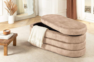 A VOQUE pad a puha pezsgőszínű bársony és az ötletes rejtett tárolóhelyek kombinációjával stílusos ülőhelyet és remek helyet biztosít a holmijaid tárolására. Akár lazítasz, akár rendszerezel, ez a pad egy csipetnyi luxust és praktikumot visz bármely szobába.