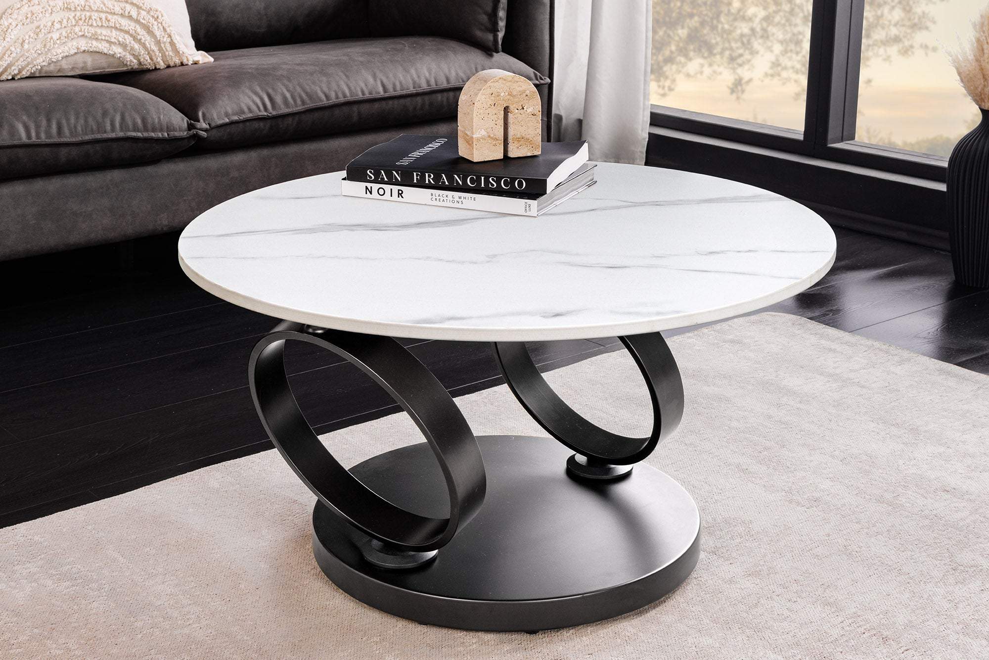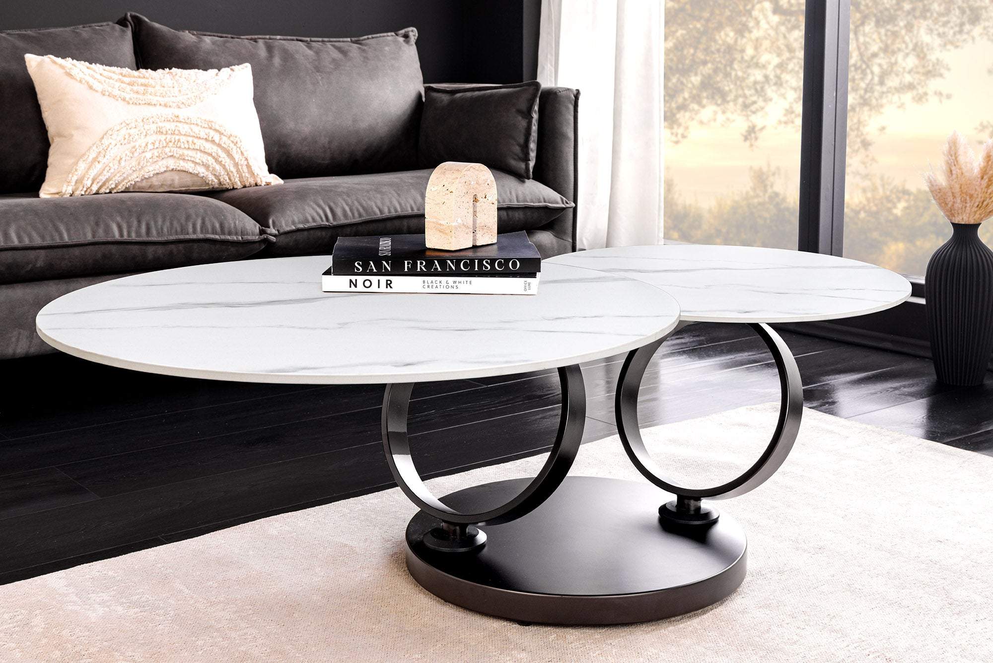 Ismerkedj meg a DANCING RINGS dohányzóasztallal, a nappalid új látványosságával, amely éppoly praktikus, mint amennyire gyönyörű! Lenyűgöző fehér és antracit márványhatású kerámia tetejével ez az asztal egy szelet modern luxust hoz otthonodba. Akár egy stílusos asztaldíszt, akár egy ötletes helytakarékos megoldást keresel, a DANCING RINGS asztal készen áll arra, hogy a következő szintre emelje a pihenést!
