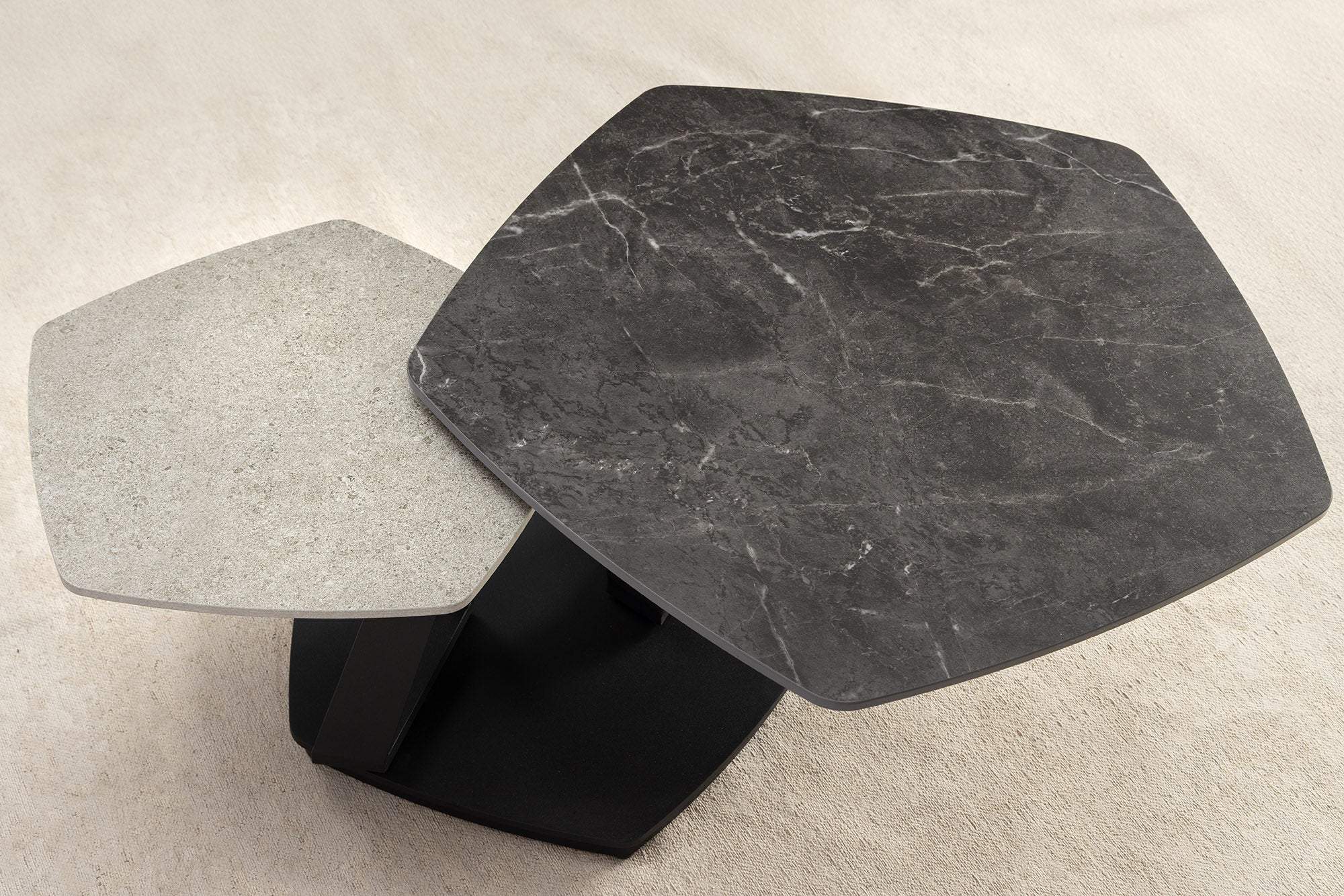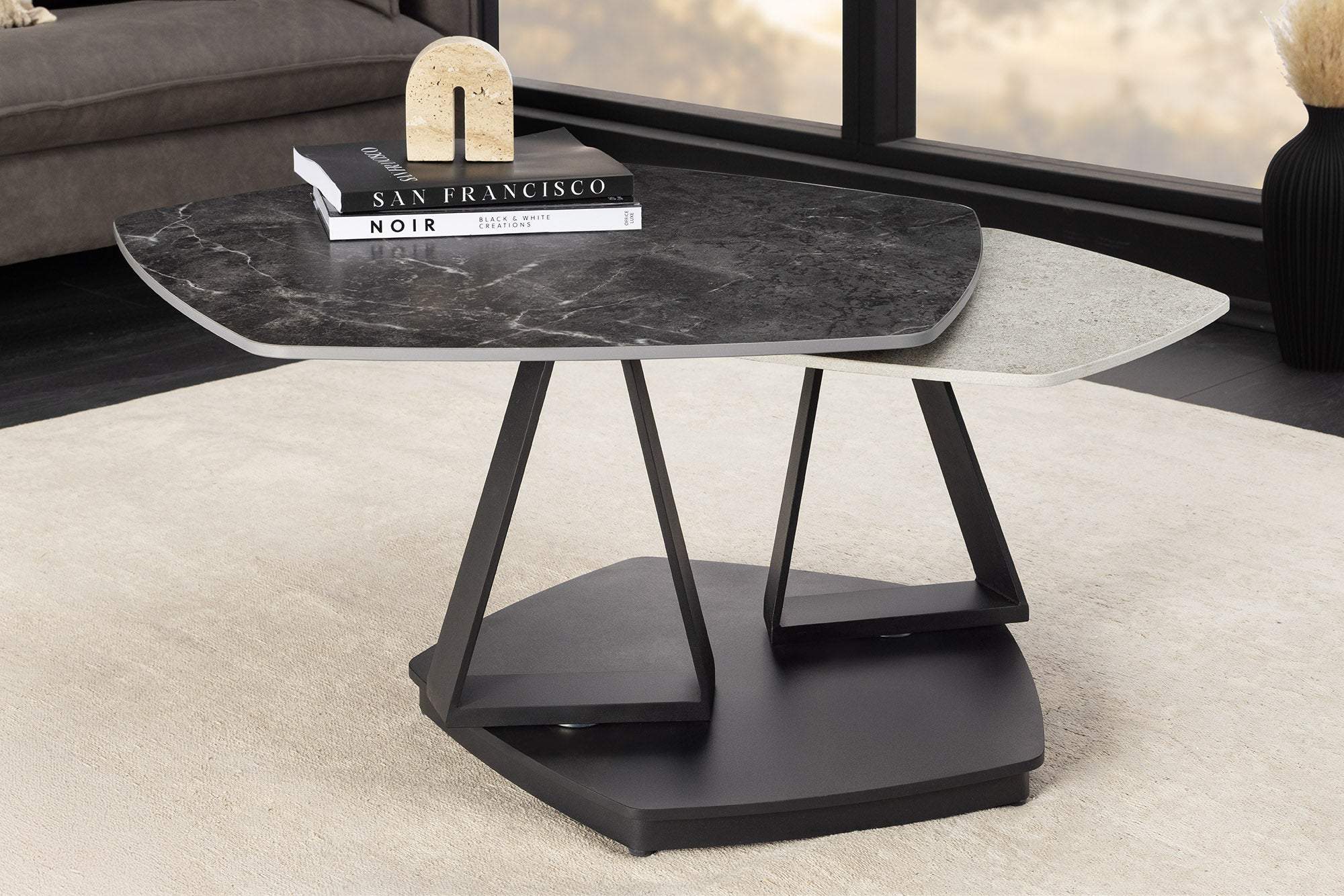 Búcsút inthetsz az unalmas asztaloknak, és üdvözölheted a MOVEMENT dohányzóasztalt, ahol a modern elegancia találkozik az okos funkcionalitással! Lenyűgöző szürke és antracit márványhatású kerámia tetejével ez az asztaldísz nemcsak szépen néz ki, de forgatható is, így méretét és alakját a hangulatodhoz, a vendégeidhez vagy a nappali elrendezéséhez igazíthatod.