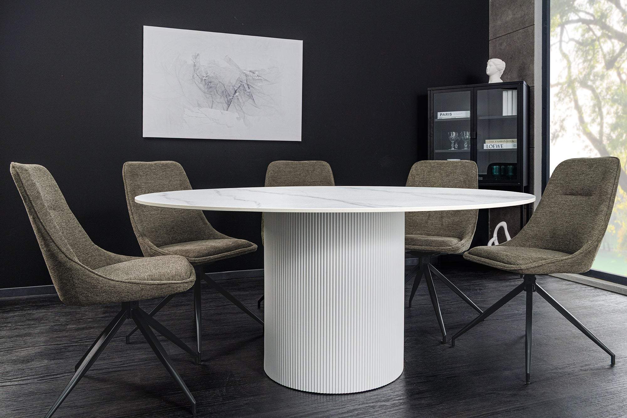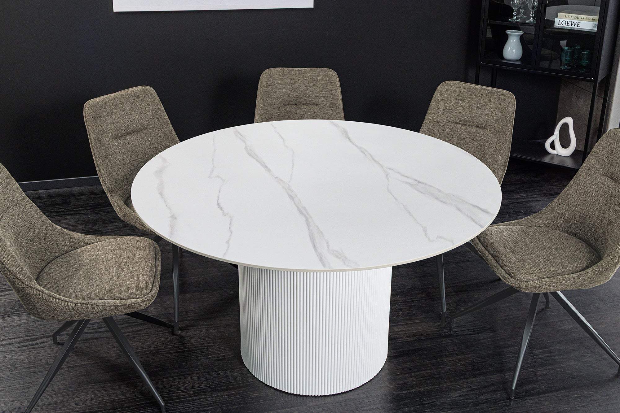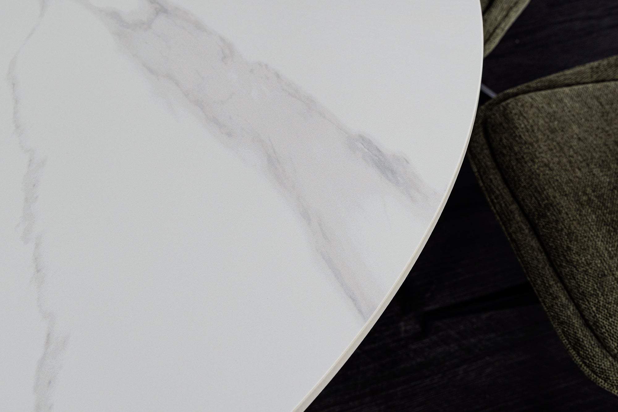 Alakítsa át étkezőjét ezzel az UNIQUE 120 cm-es kerek étkezőasztallal, mely feltűnő fehér márványhatású kerámia tetejű és elegáns fekete vázzal rendelkezik, ami biztosan feltűnő látványt nyújt. A stílusos lábtér nemcsak helyet takarít meg, hanem modern és kifinomult megjelenést is kölcsönöz az asztalnak.