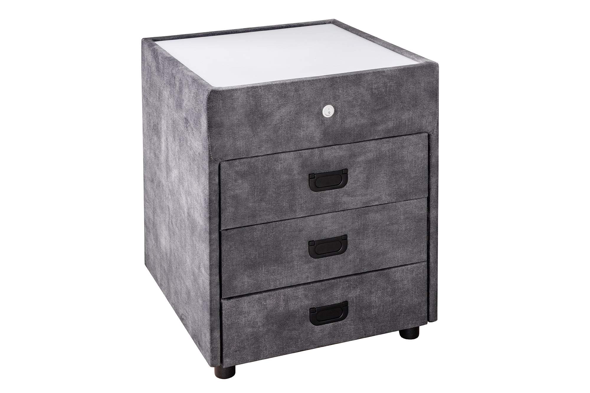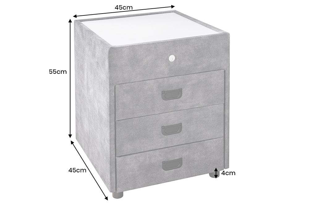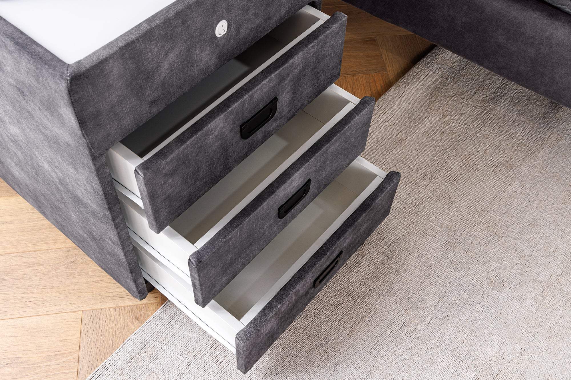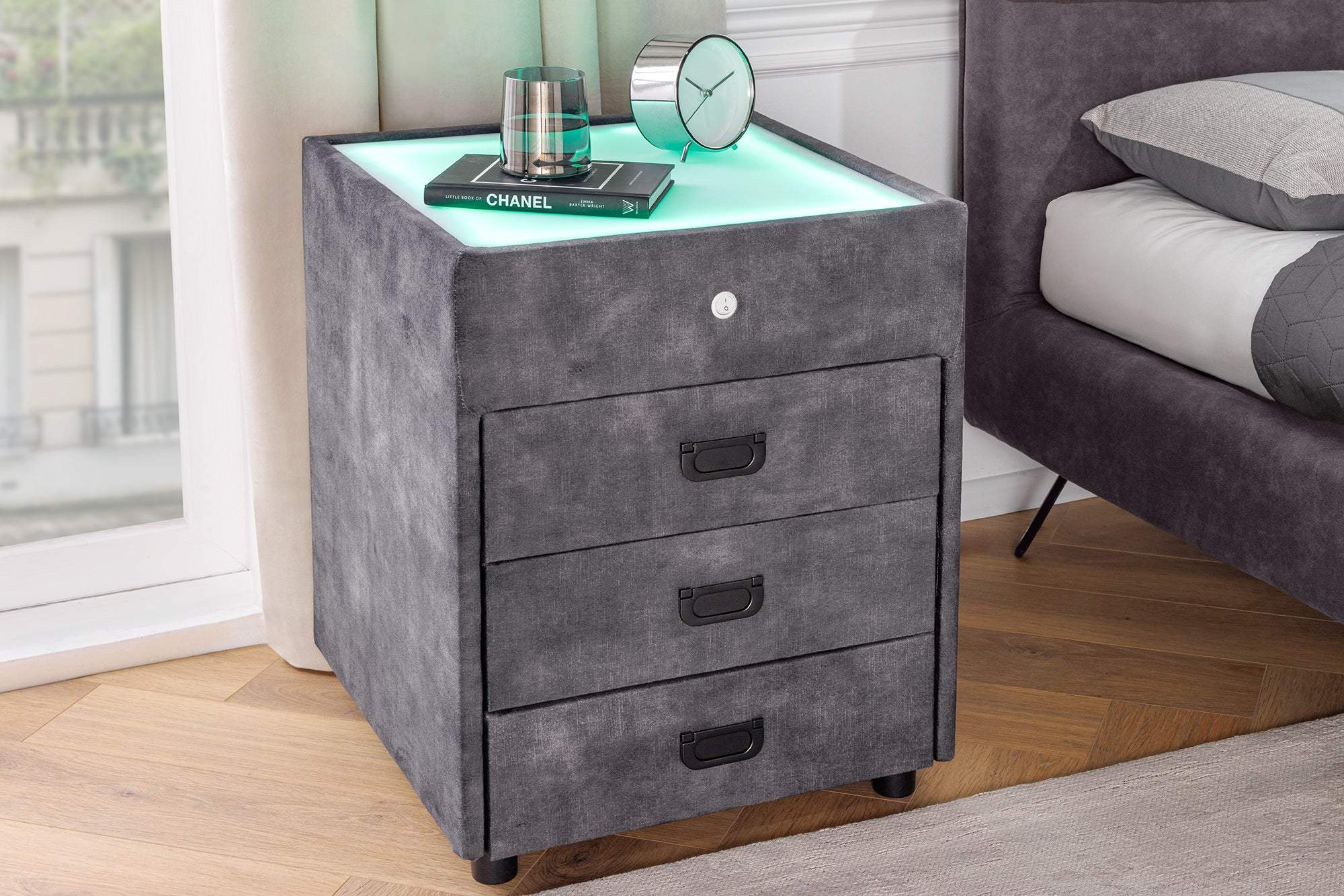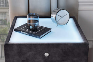 A PARIS éjjeliszekrény a modern dizájnt puha szürke bársonnyal és beépített LED-lámpával ötvözi, amely meleg fényt kölcsönöz az estéidnek. Egyszerűen nyomd meg többször a be/ki gombot a LED színének megváltoztatásához és a tökéletes hangulat megteremtéséhez.