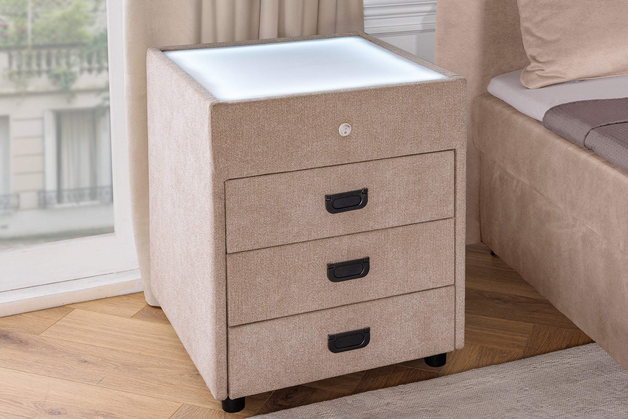 Az elegáns bársonyból készült TOULOUSE éjjeliszekrény stílusos kiegészítője lehet hálószobádnak, beépített LED világítással a meghitt fényért. A LED színe a be/ki gomb többszöri megnyomásával módosítható, így a kívánt hangulatot teremtheted meg.