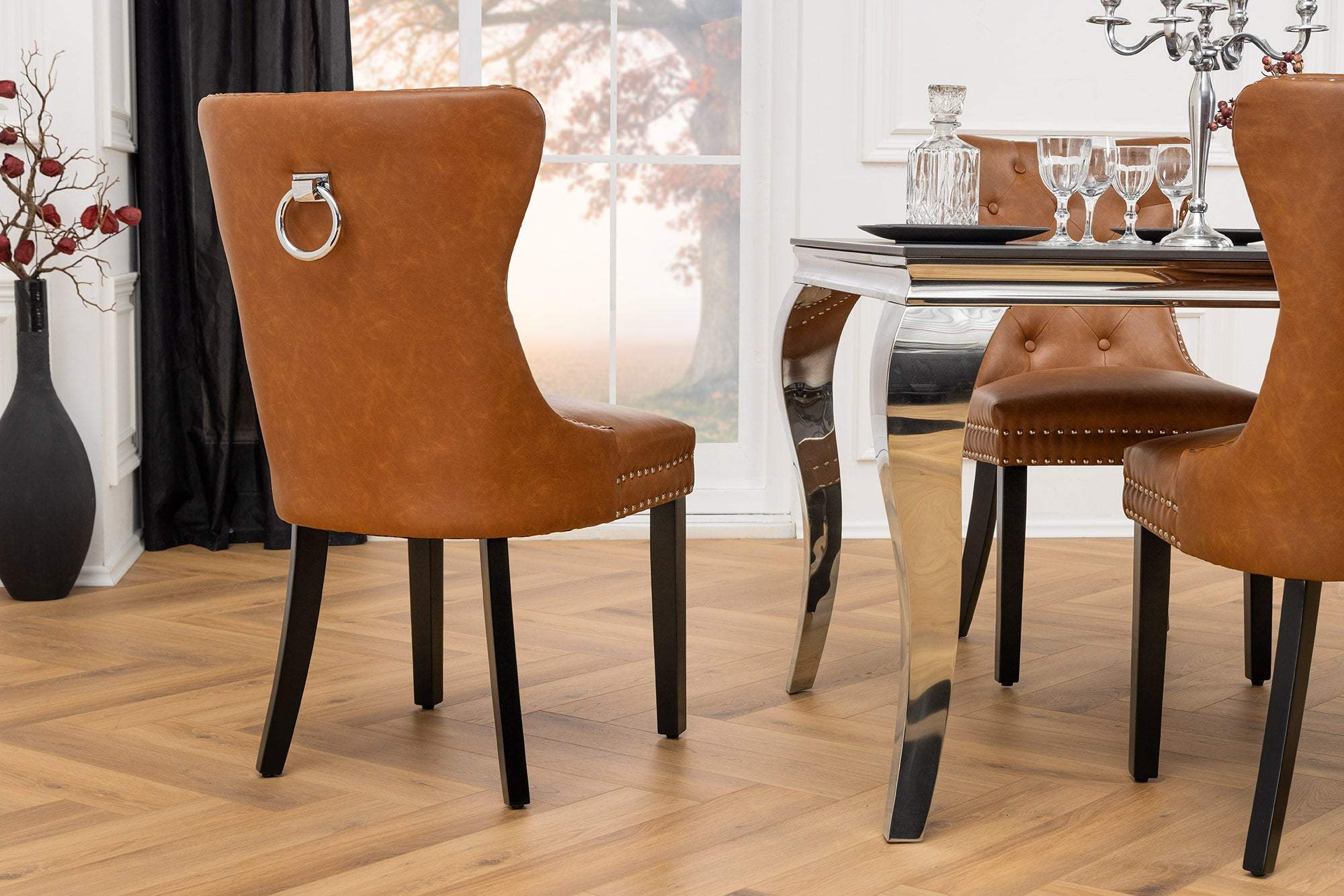 A konyakbarna műbőr CASTLE szék a klasszikus Chesterfield dizájnt ötvözi a mindennapi funkcionalitással, kényelmes fogantyúval és könnyen tisztítható felülettel. Masszív konstrukciójának és elegáns kidolgozásának köszönhetően sokoldalú választás mind professzionális, mind magáncélú enteriőrökbe.