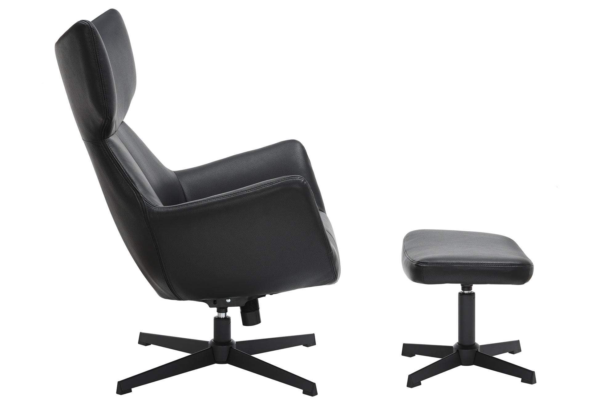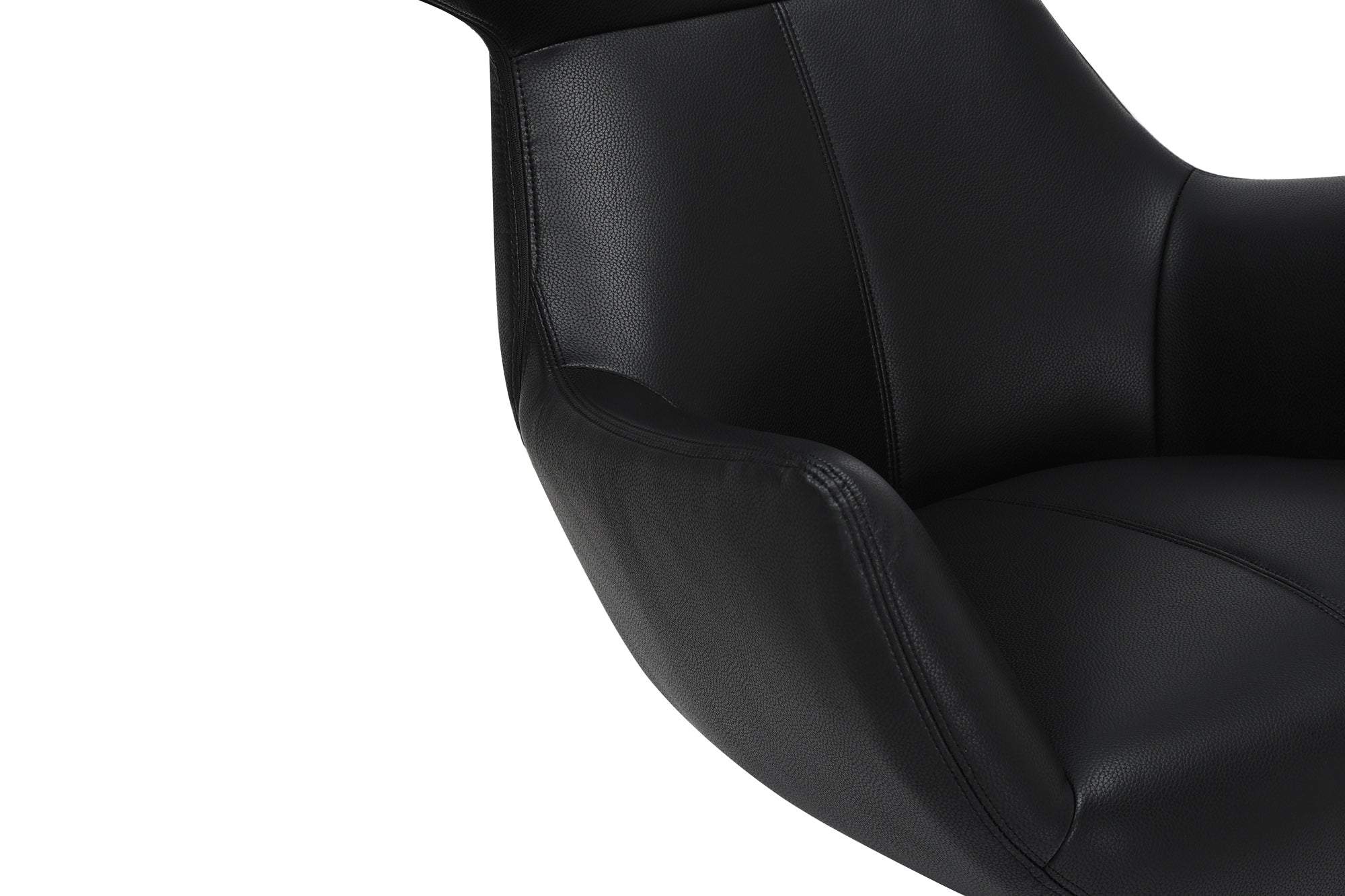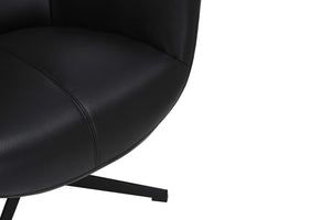 A VOGUE karosszék elegáns fekete bőrből készült, 360°-ban forgatható és dönthető funkciójával a luxus és a rugalmasság tökéletes keverékét kínálja. A kényelem és a stílus jegyében készült, ideális hely a kikapcsolódásra, olvasásra vagy beszélgetésre, miközben merész látványt nyújt bármely szobának.