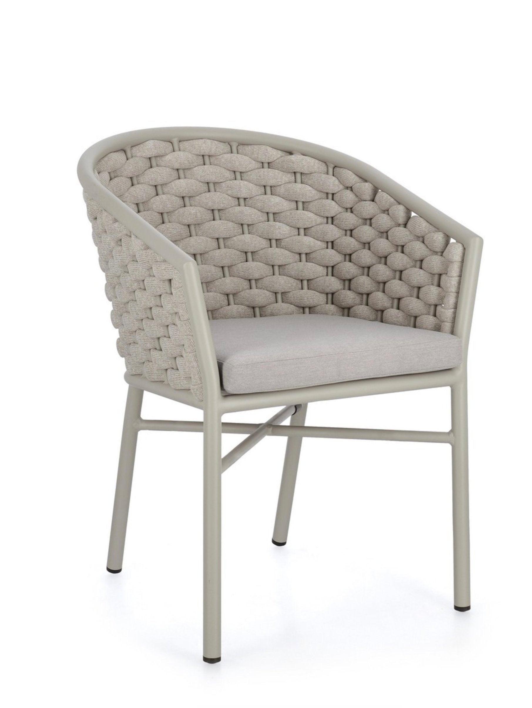 A MARGALIDA bézs kerti szék porfestett alumínium váza és gumírozott poliészter kötélfonása nem csak időtálló, de modern megjelenést is kölcsönöz neki..