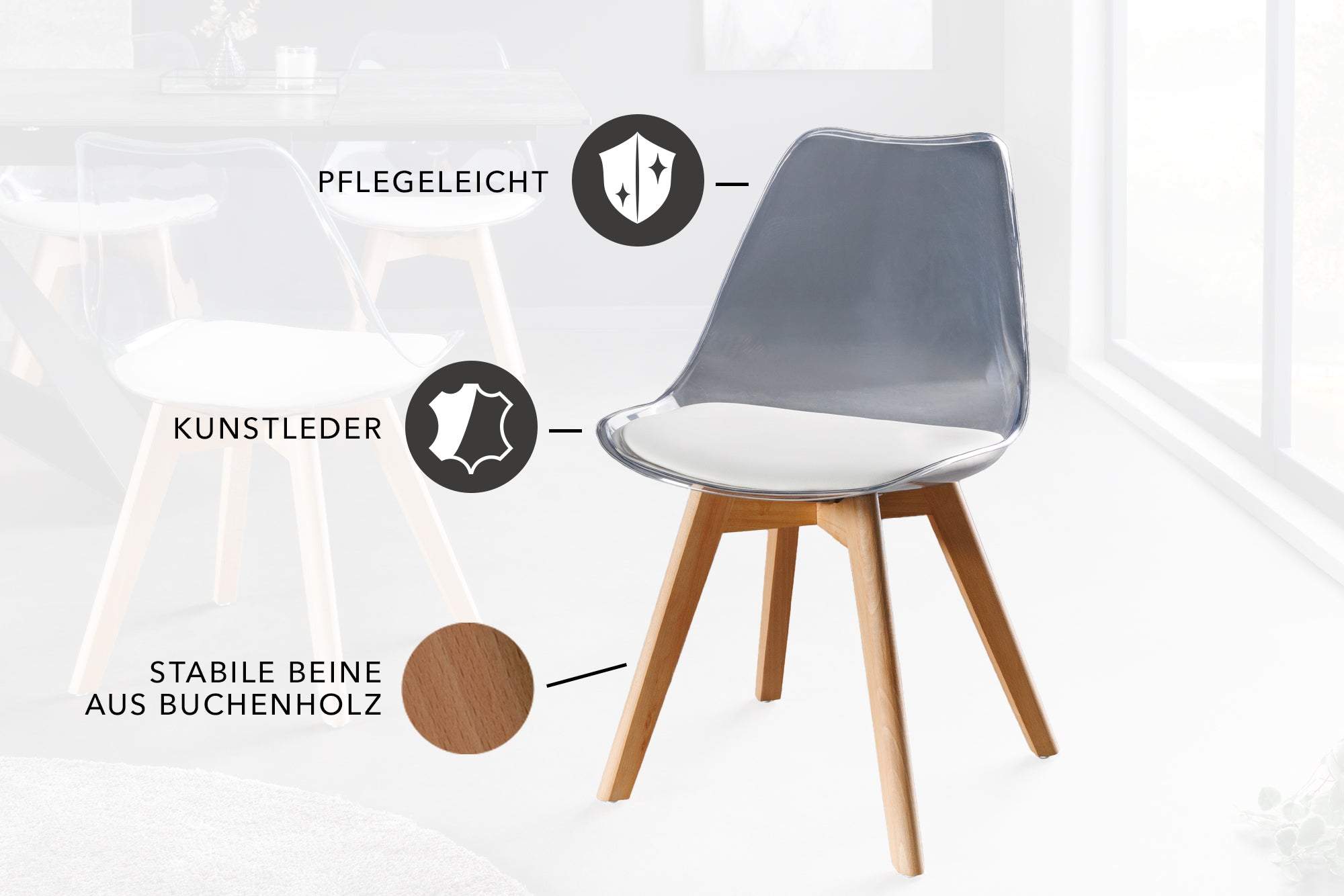 A SCANDINAVIA MEISTERSTÜCK szék a skandináv báj és a modern egyszerűség tökéletes ötvözete otthonába vagy irodájába. Átlátszó fehér ülőfelületével, amely kiváló minőségű anyagokból készült, ez a szék ugyanolyan stílusos, mint amennyire kényelmes.