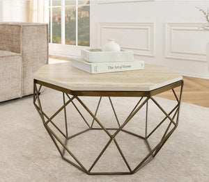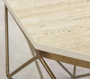 A nyolcszögletű asztallap természetes travertin kőből készült, amely egyedi textúrájával és világos árnyalatával kontrasztot alkot a réz vázzal, így harmonikus és letisztult összhatást teremt. A kiváló minőségű anyagoknak köszönhetően az asztal tartós és időtálló, miközben exkluzív hangulatot varázsol a belső térbe.