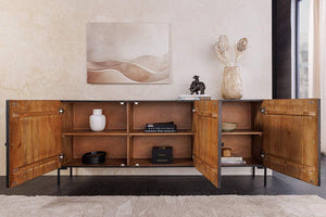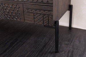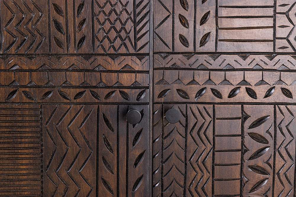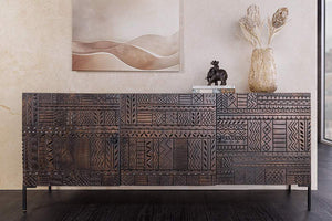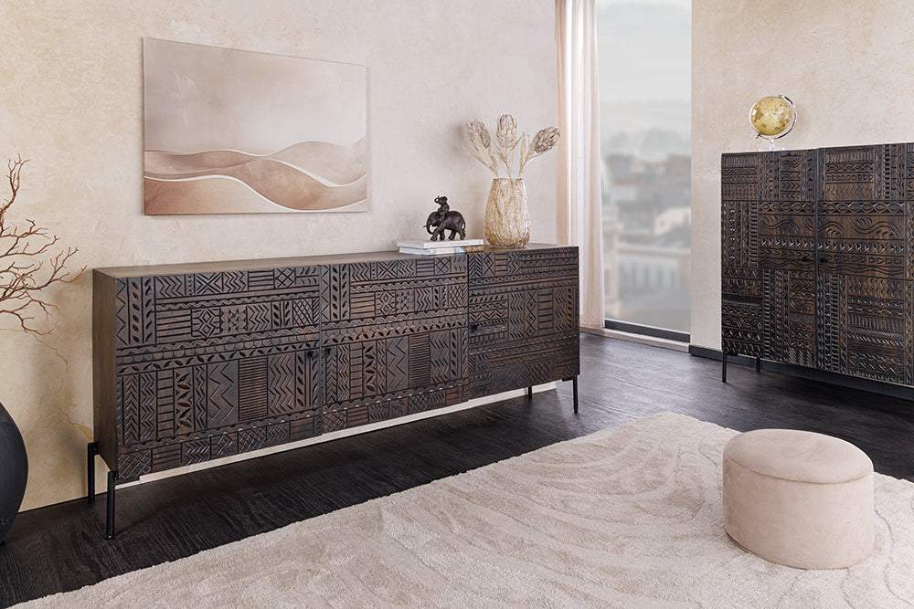 Köszöntsd a TRIBAL tálalószekrényt – az új kedvenc darabodat, amellyel egyéniséget vihetsz otthonodba. Gazdag, sötétbarna mangófából készült, lenyűgöző fekete polccal, ez a tálalószekrény karaktert és melegséget sugároz.