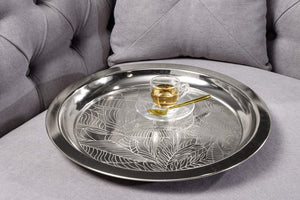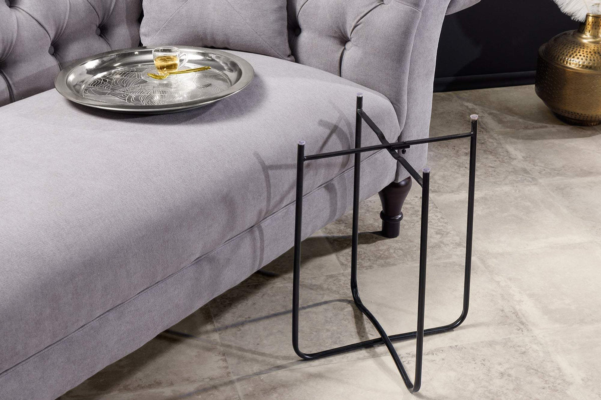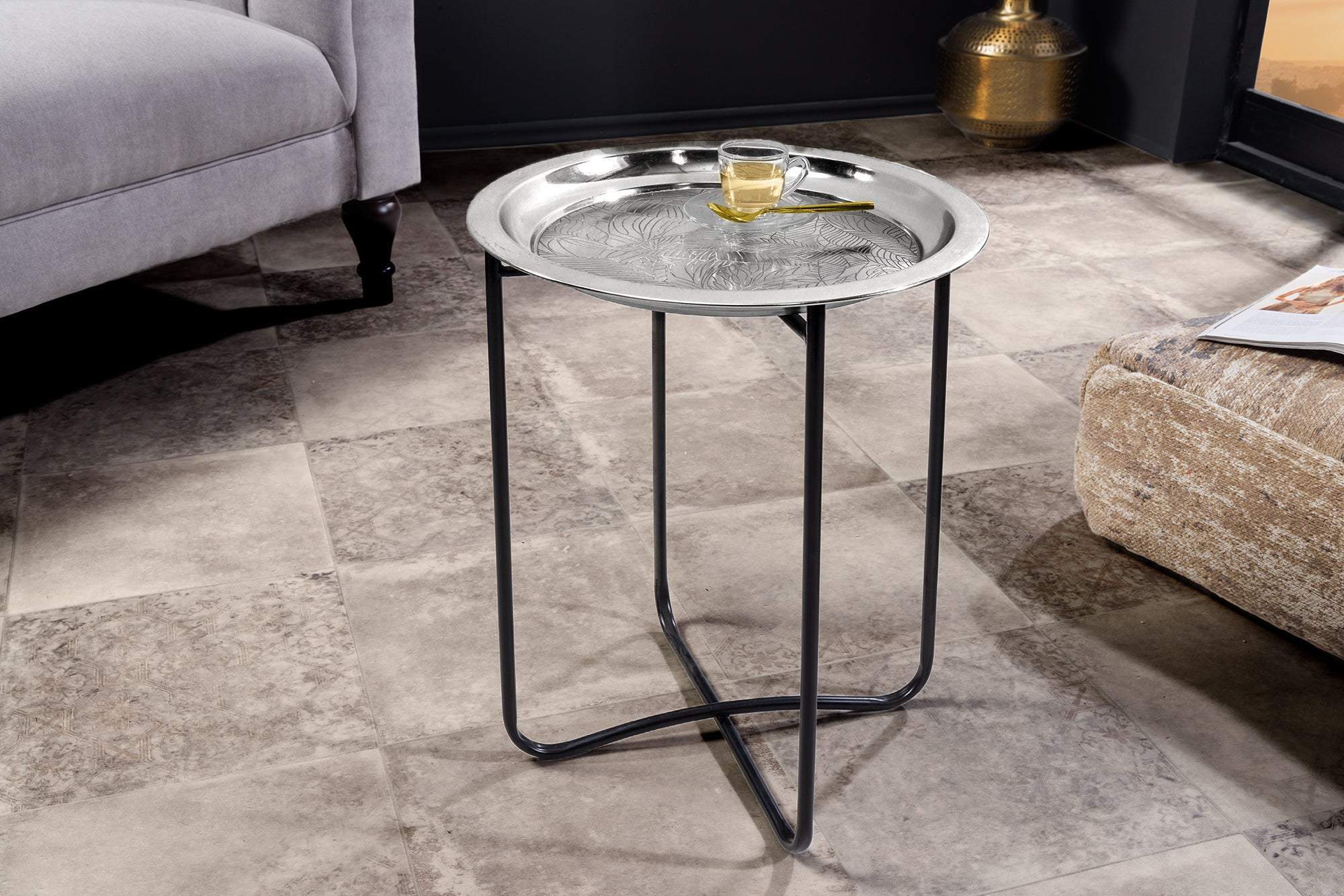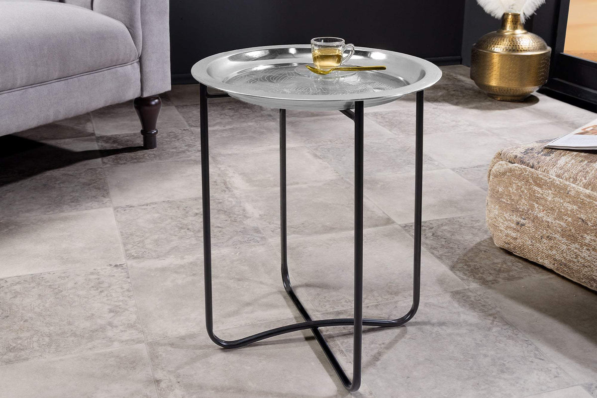 Ez a stílusos és modern kisasztal kiváló választás minden otthonba, ahol a funkció és az esztétikum találkozik. A fém tálca asztallap elegáns, ezüstös árnyalatú, amely tökéletesen illeszkedik a különféle belső terekhez. Az esztétikus kialakítás mellett az asztal praktikus is: könnyen tisztítható, így ideális választás lehet nappaliba, hálószobába vagy akár teraszra is.
