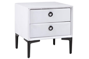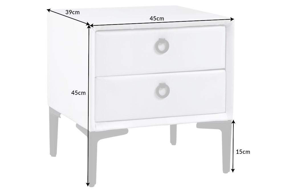 A képen látható termék egy elegáns és modern éjjeliszekrény, amely tökéletes kiegészítője lehet bármilyen hálószobabelsőnek. Ez a szekrény kifinomult stílust és funkcionalitást kínál, amelyet a két tágas fiókja biztosít. A fiókok fém fogantyúkkal vannak ellátva, amelyek nemcsak esztétikailag vonzóak, hanem könnyű hozzáférést is biztosítanak a tárolt tárgyakhoz.