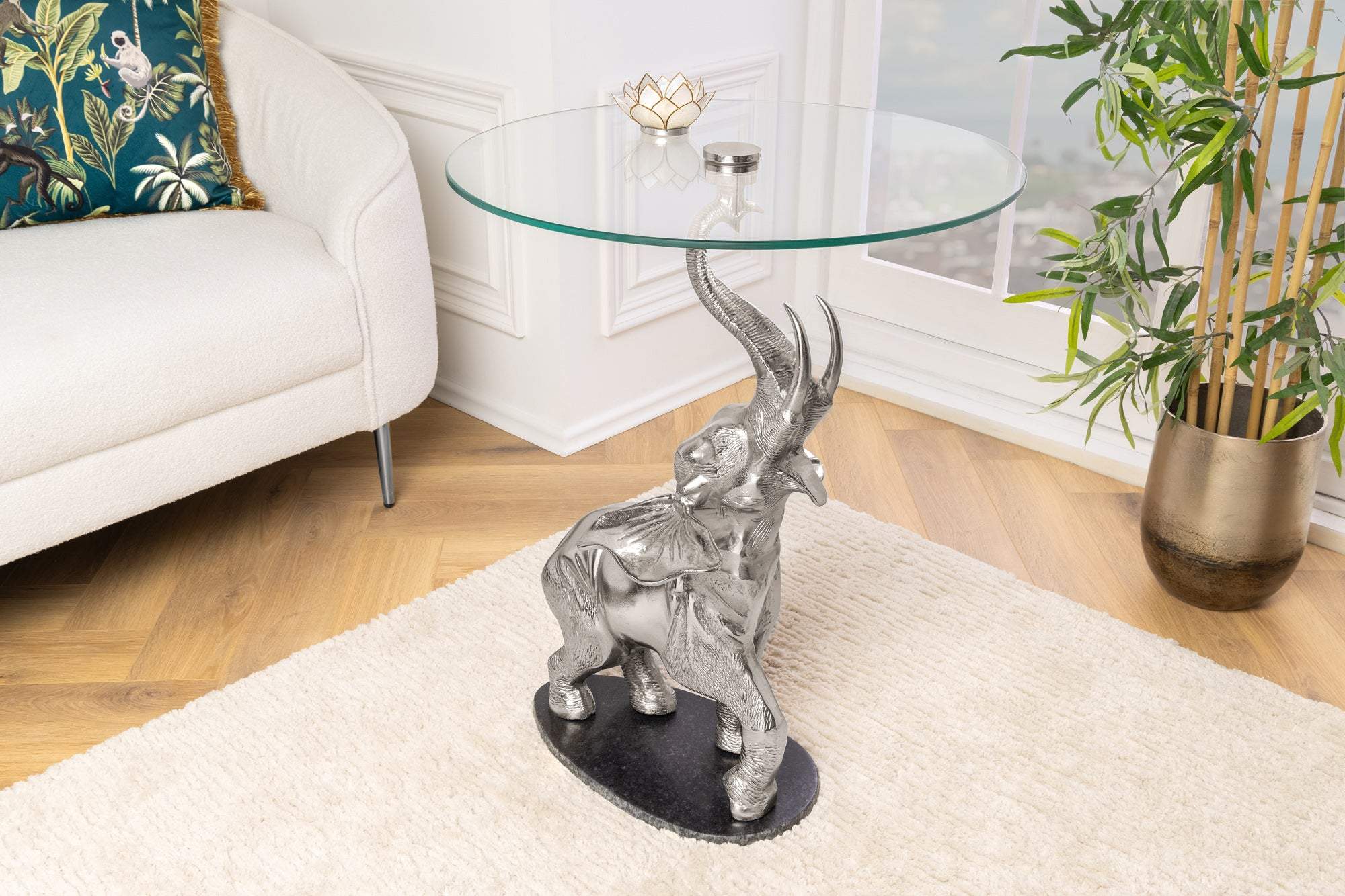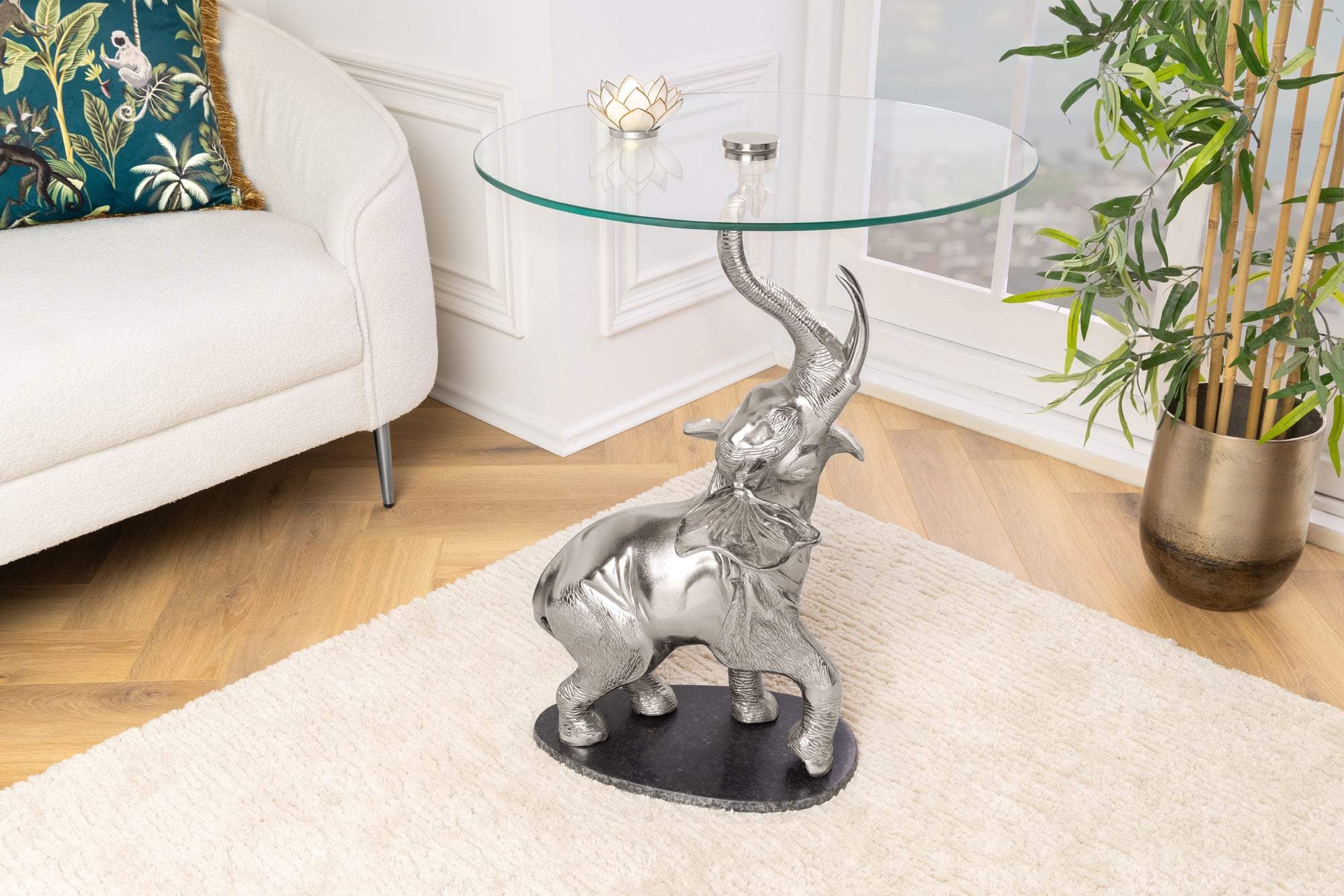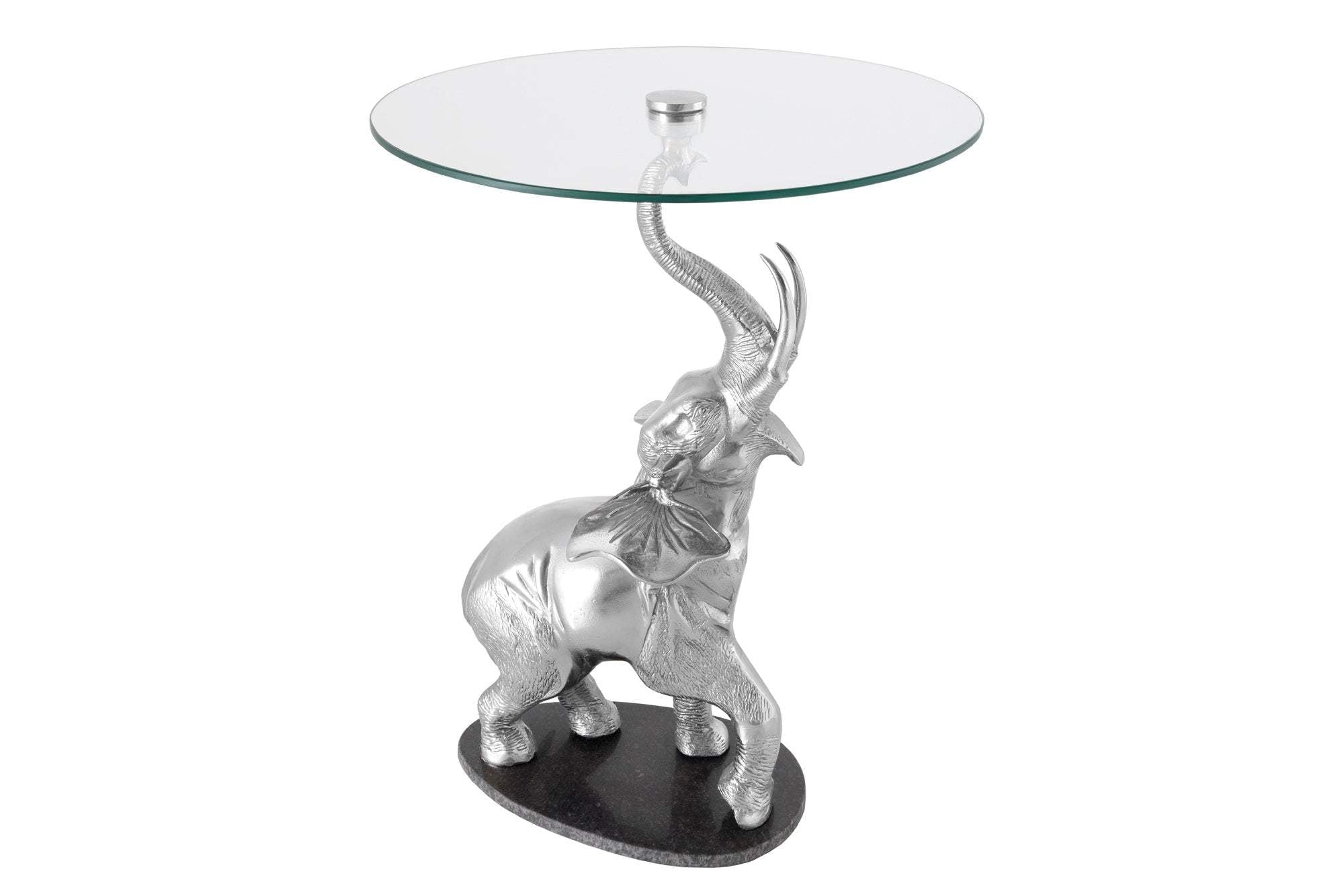 Ez a lenyűgöző, elefánt alakú asztalka tökéletes kiegészítője lehet bármely lakótérnek. A termék elegáns megjelenését a részletgazdag, ezüst színű elefánt figura adja, amely szilárdan tartja a kerek, átlátszó üveglapot. Az asztal modern és egzotikus stílusának köszönhetően könnyedén illeszkedik különféle enteriőrökbe, legyen szó modern, klasszikus vagy eklektikus berendezésről.