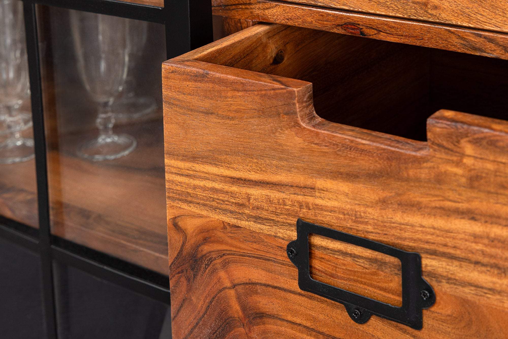 A HERITAGE vitrin a klasszikus hangulatot és a modern dizájnt ötvözi a meleg akácfa és a letisztult fekete fém díszítésekkel. Tökéletes darab arra, hogy megmutassuk, mi a legfontosabb, miközben a dolgok könnyedén stílusosak maradnak.