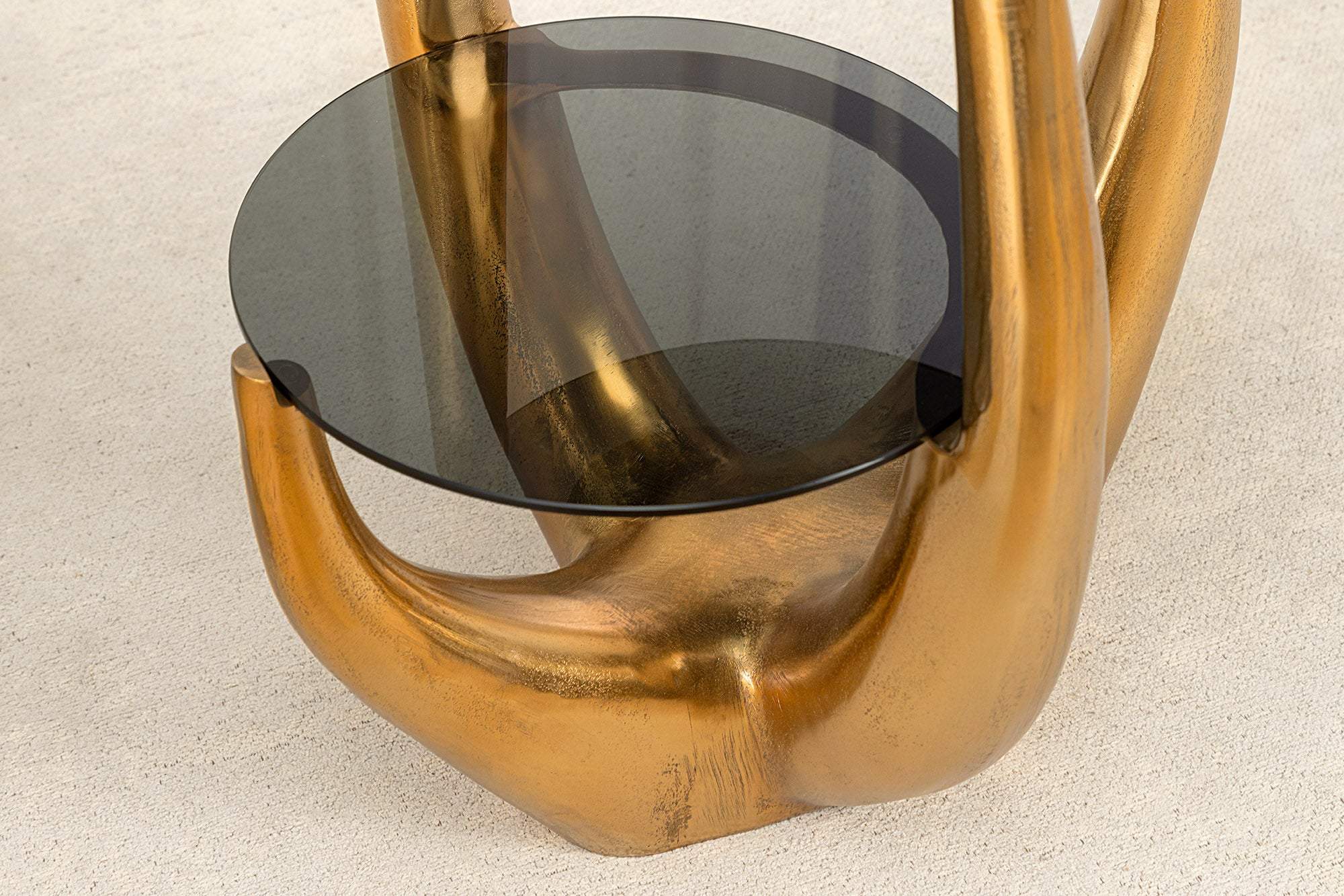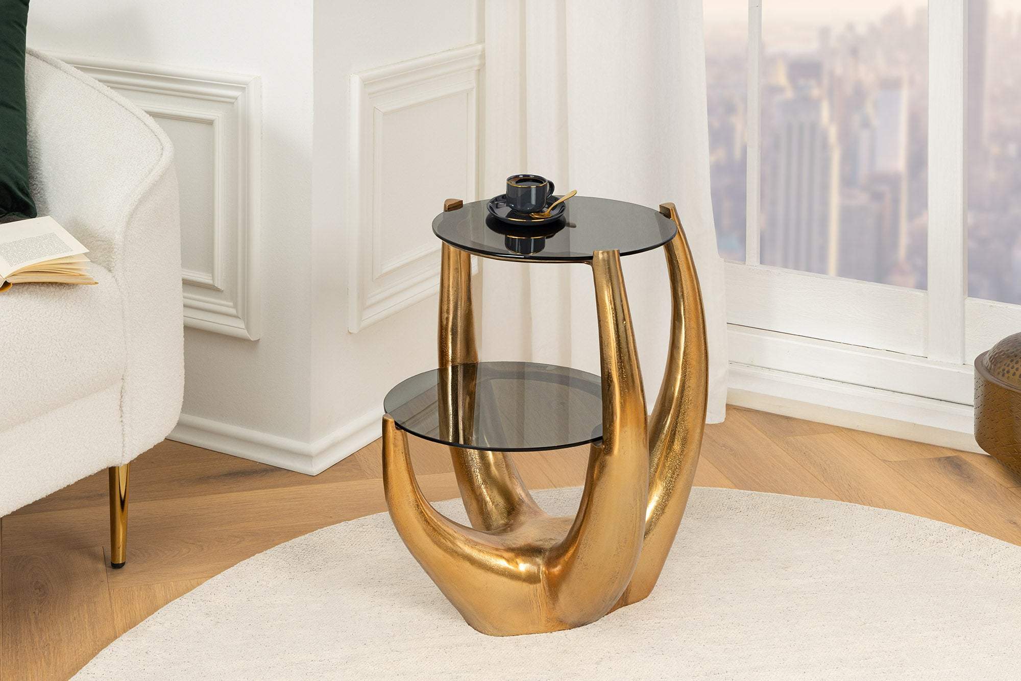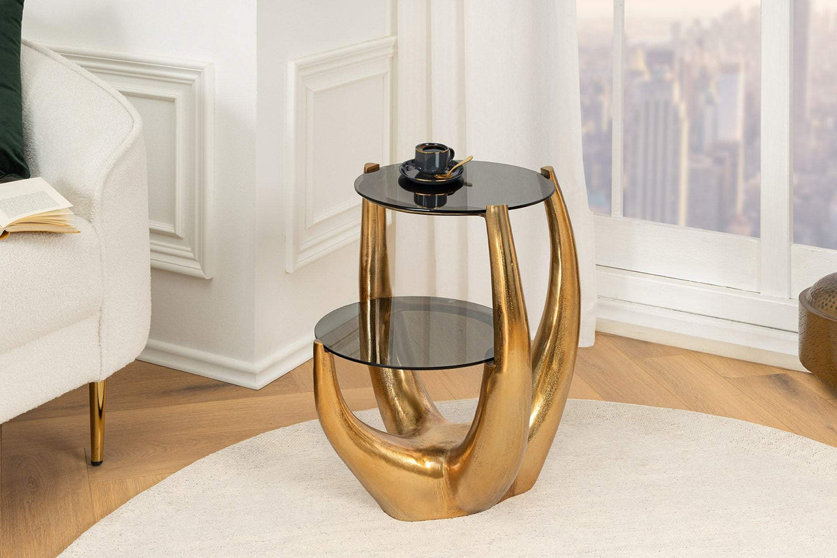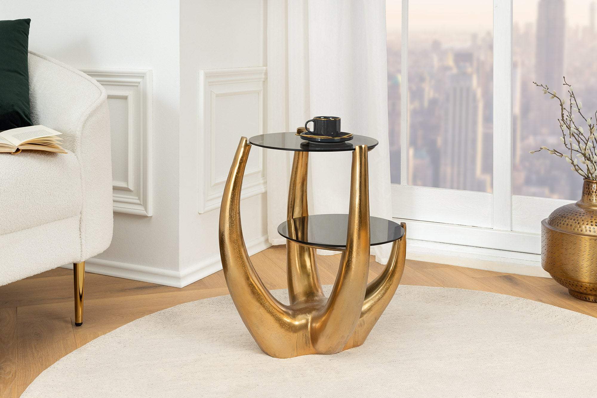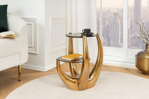 A termék különlegessége az arany színű, szoborszerű alap, amelyet ívelt formák jellemeznek. Ez a design nemcsak esztétikai előnyöket nyújt, hanem stabilitást és tartósságot is biztosít. Az arany szín melegséget és luxust sugároz, így bármely nappali vagy hálószoba központi elemévé válhat.