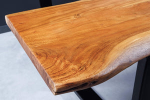 Ez a gyönyörű, természetes fa pad a modern és a rusztikus stílus tökéletes kombinációja. Kiváló minőségű tömör faanyagból készült, mely tartós és strapabíró, így hosszú éveken át megőrzi szépségét. Az egyedi, hullámos vonalvezetés és a fém lábak elegáns kontrasztot alkotnak, így bármely belső tér látványos kiegészítője lehet.