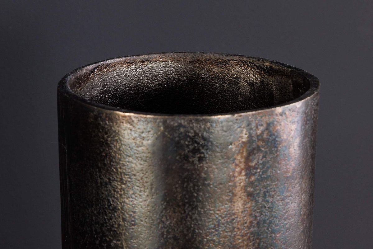 Egyedi, művészien megmunkált fém váza, amely letisztult formavilágával és különleges textúrájával az otthon bármely helyiségének elegáns kiegészítője lehet. Ez a váza kiváló minőségű anyagokból készült, garantálva a tartósságot és az időtállóságot.
