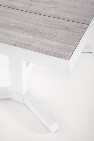 A 10 mm vastag kerámia lappal borított asztallap kőhatású megjelenésével eleganciát sugall, mégis ellenálló és könnyen tisztán tartható. A porszórt alumíniumból készült váz rendkívül stabil és rozsdamentes, így kültéri használatra kiváló.