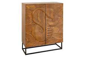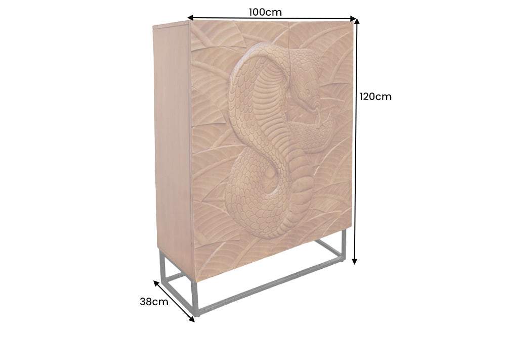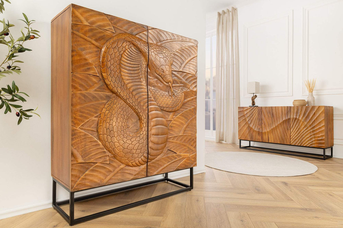 A fa bútor elegáns megjelenésével és egyedi stílusával tökéletes kiegészítője lehet bármelyik otthonnak. A részletesen kidolgozott kígyó minta az ajtókon nemcsak esztétikai értéket képvisel, hanem egy különleges történetet is mesél. Ez a szekrény nem csupán egy tárolóegység, hanem egy valódi műalkotás, amely minden helyiség középpontjává válhat.