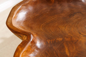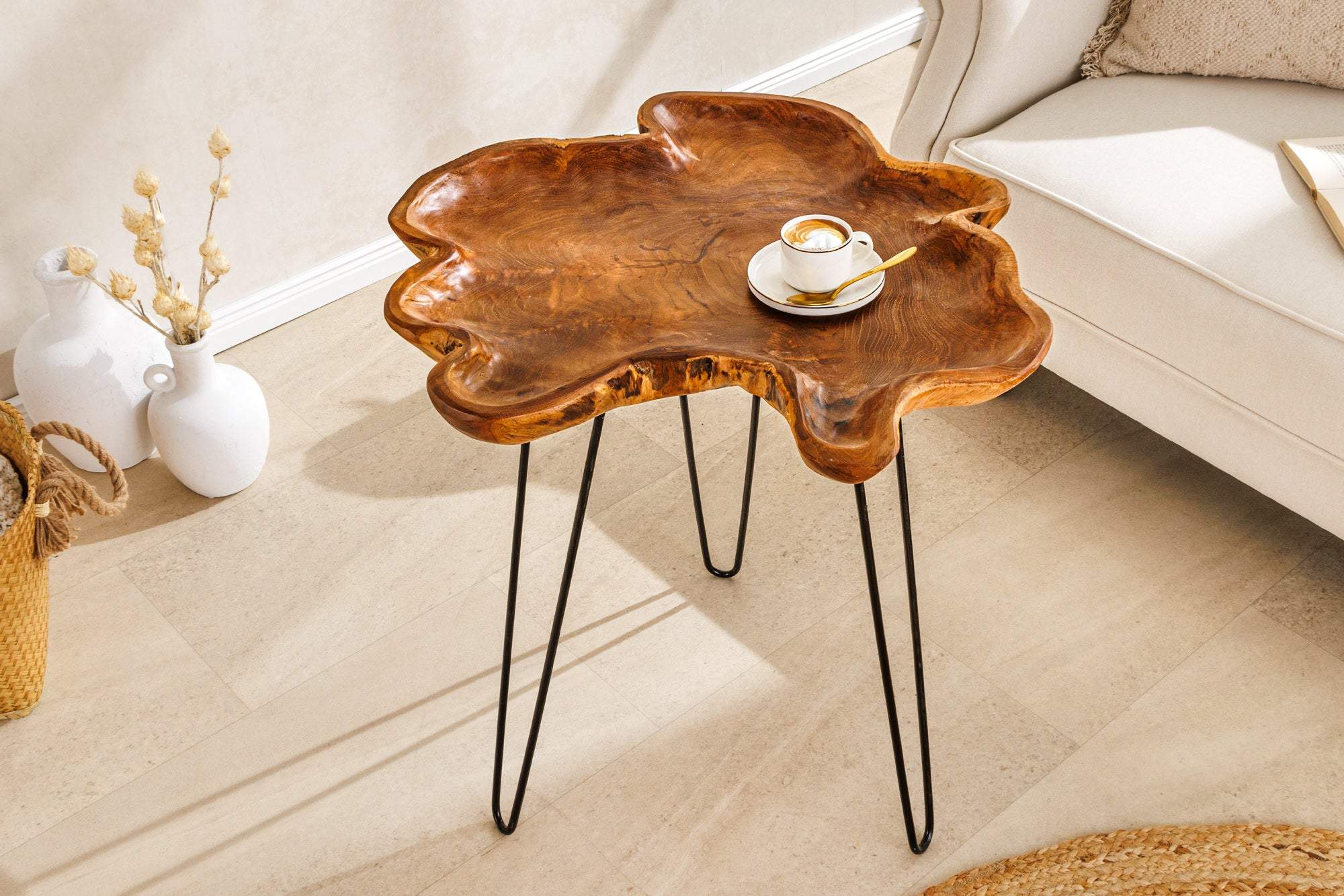 Ez a különleges és stílusos asztal igazi műalkotás minden modern vagy rusztikus enteriőrben. Kézzel készített, természetes faanyagból, amely egyedülálló formájával és erezetével vonzza a tekintetet. A faasztal teteje organikus formájának köszönhetően egyedi és természetközeli megjelenést kölcsönöz bármely helyiségnek.